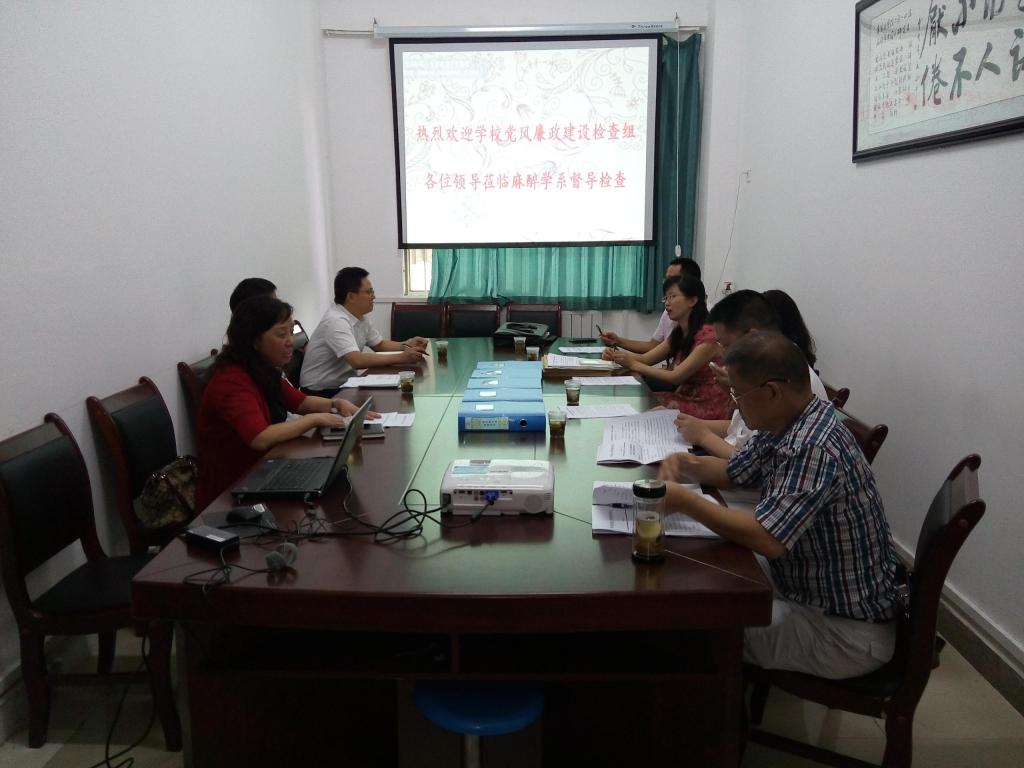 7月9日上午,校党委组织部李兴部长率第三督导检查小组一行对麻醉学系进行2015年党风廉政建设责任制落实情况中期检查,现场听取工作汇报,查阅了相关材料。麻醉学系领导班子成员及相关人员参加了会议。