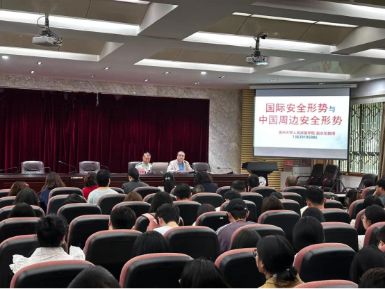 贵州大学人民武装学院赵永伦教授受邀现场讲课。赵教授围绕当今国际安全形势、中国周边安全形势、中国维护国家安全的总体战略三个方面展开讲解。他从政治、经济、科技、文化、军事、世界热点等问题来讲解当前的国际形势与安全,结合我国复杂的周边环境与安全来阐述中国的安全形势和总体国家安全和国防安全,维护国家安全和国家领土主权完整。