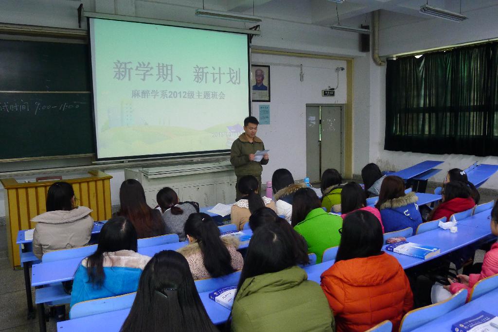 新的学期又将是一段崭新的航程,为加强学风建设,增强班级凝聚力。麻醉学系2012级全体同学于3月11日上午在北京路校区1201教室开展了以“新学期、新计划”为题的主题班会课。