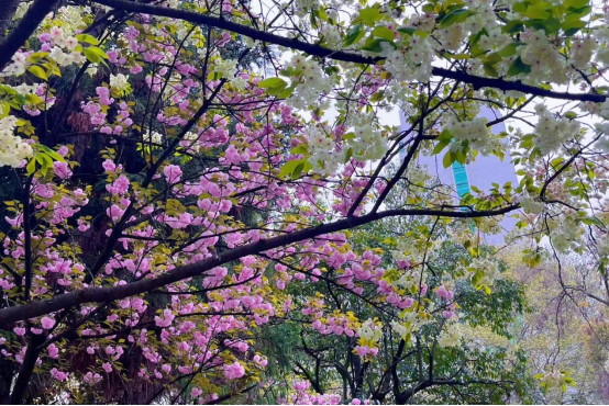 透过树干缝隙拍摄的校园一角,行人、车辆与繁花绿树交织,充满生活气息;