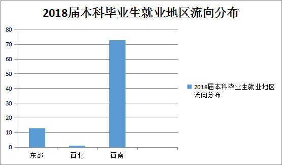 2018届本科毕业生就业地区分布情况为:东部地区13人,占12.38%,西北部1人,占0.95%,西南部73人,占69.52%。