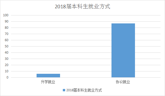 2018届本科毕业生就业方式情况为:升学就业6人,占就业总人数的5.71%,协议就业88人,占就业总人数的83.81%。