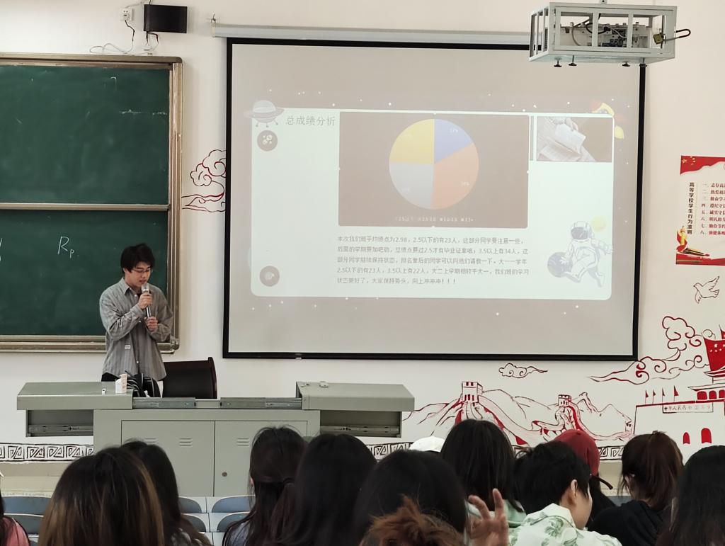 会议开始学习委员黄崧倪就上学期期末考试各科目进行了专项分析,指出本次总体成绩较之前有所提升,挂科人数减少,但是提升空间也很大,倡议继续增强学习氛围,再创新高。学生代表彭勃分享自己的高效的学习方法,同学们受益匪浅。