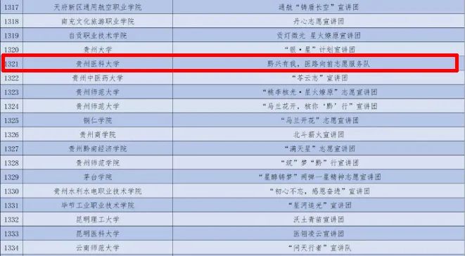近日,团中央青年志愿者行动指导中心联合有关部门开展2025年全国大学生“两弹一星”精神志愿宣讲团系列志愿宣讲活动,我院申报的“黔兴有我,医路前行”志愿服务队成功入选。